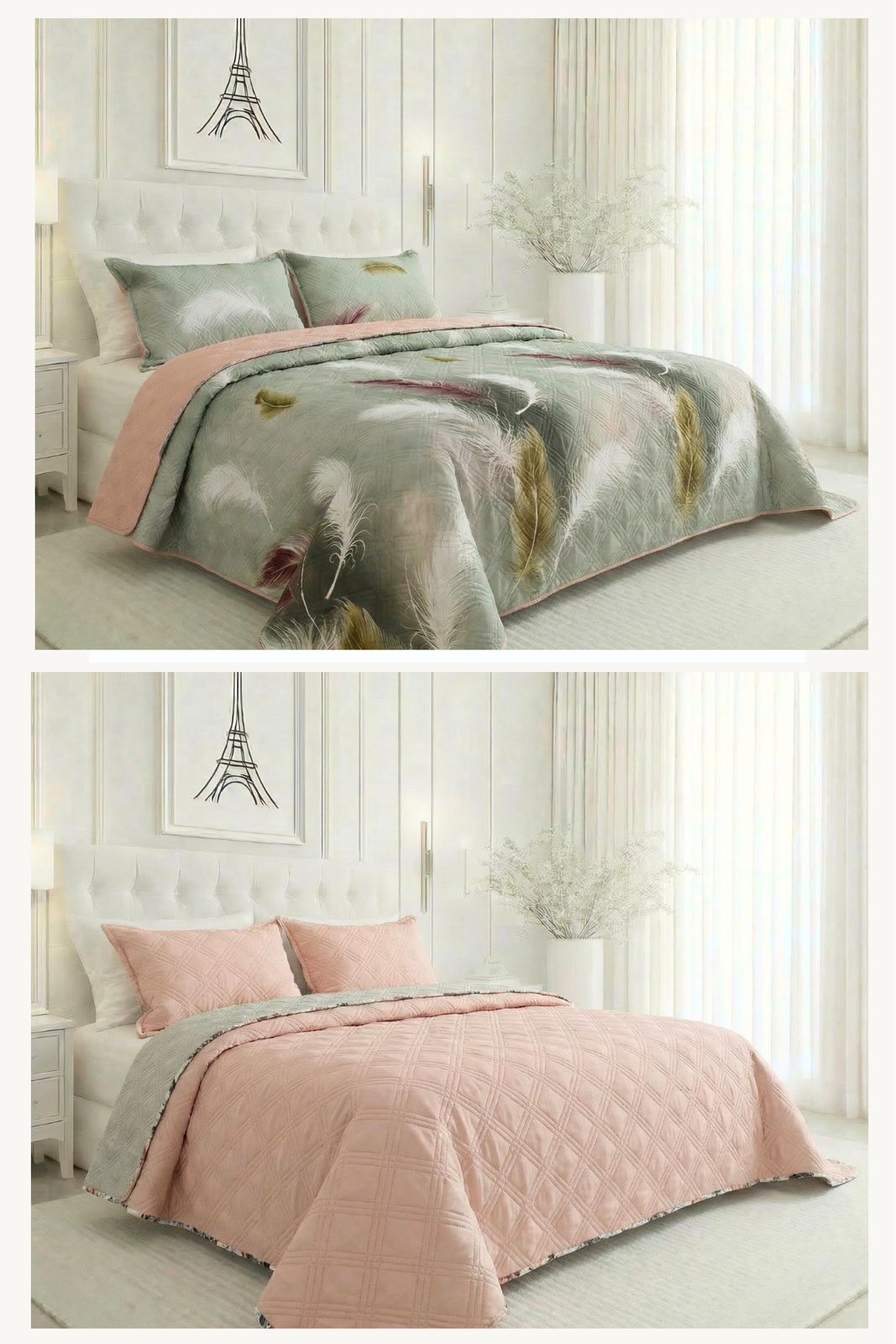 COLCHA ESPAÑOLA DE GRAN COMODIDAD Y ELEGANCIA. TERMOSELLADA, ESTAMPADA EN UNA COMPOSICIÓN DE MICROFIBRA TOTALMENTE REVERSIBLE (DOBLE FAZ), TIENE LA OPORTUNIDAD DE CAMBIAR TOTALMENTE EL AMBIENTE DE TU HABITACION CON TAN SOLO DARLE LA VUELTA PARA UNA MAYOR VERSATILIDAD.