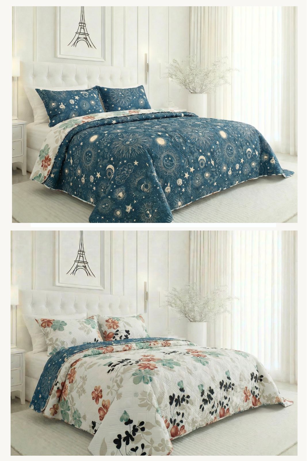 COLCHA ESPAÑOLA DE GRAN COMODIDAD Y ELEGANCIA. TERMOSELLADA, ESTAMPADA EN UNA COMPOSICIÓN DE MICROFIBRA TOTALMENTE REVERSIBLE (DOBLE FAZ), TIENE LA OPORTUNIDAD DE CAMBIAR TOTALMENTE EL AMBIENTE DE TU HABITACION CON TAN SOLO DARLE LA VUELTA PARA UNA MAYOR VERSATILIDAD.